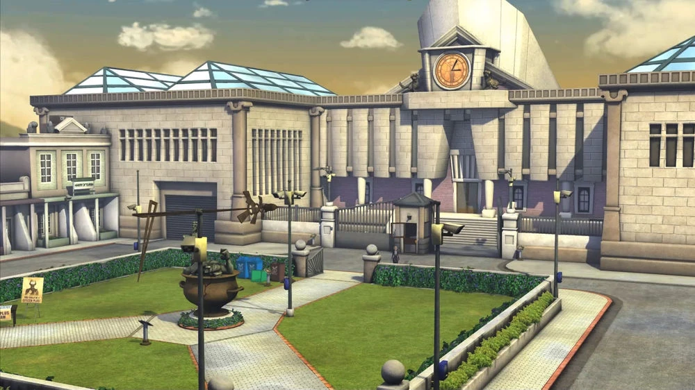 - Usando una de las ruedas que hacen que el automóvil vuele, alimentándola con la batería del auto, pasa por encima de una gran muralla que rodea la ciudad y vuela hasta la plaza de la Corte. Allí, se encuentra con que la ciudad ahora tiene edificios más altos, todos usan la misma ropa anaranjada y amarillo crema, viajan en autos similares a carros de golf, y la Corte ha sido drásticamente renovada y su reloj fue reemplazado por uno funcional.