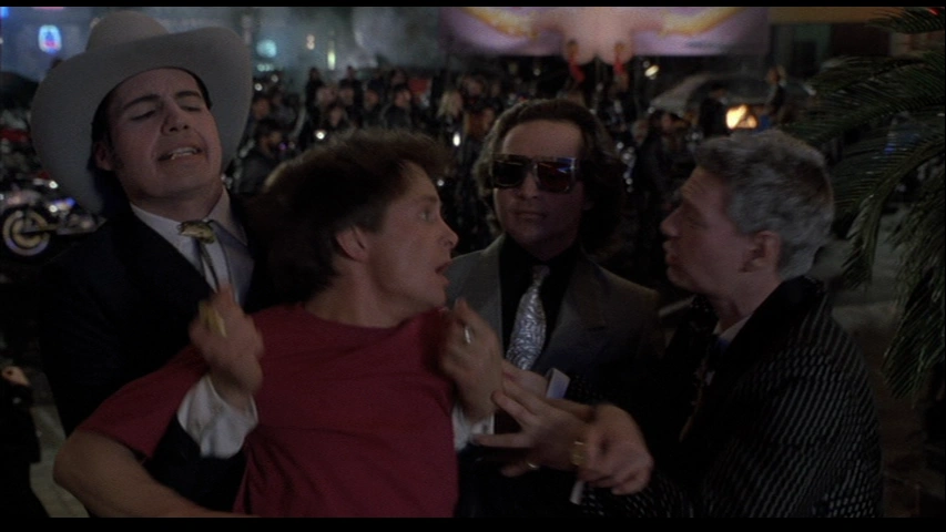 3-D (segundo desde la derecha) y su grupo capturan a Marty McFly en 1985.