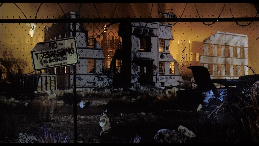 Una valla de tela metálica rematada con alambre de púas rodea los restos calcinados de Hill Valley High School en 1985A.
