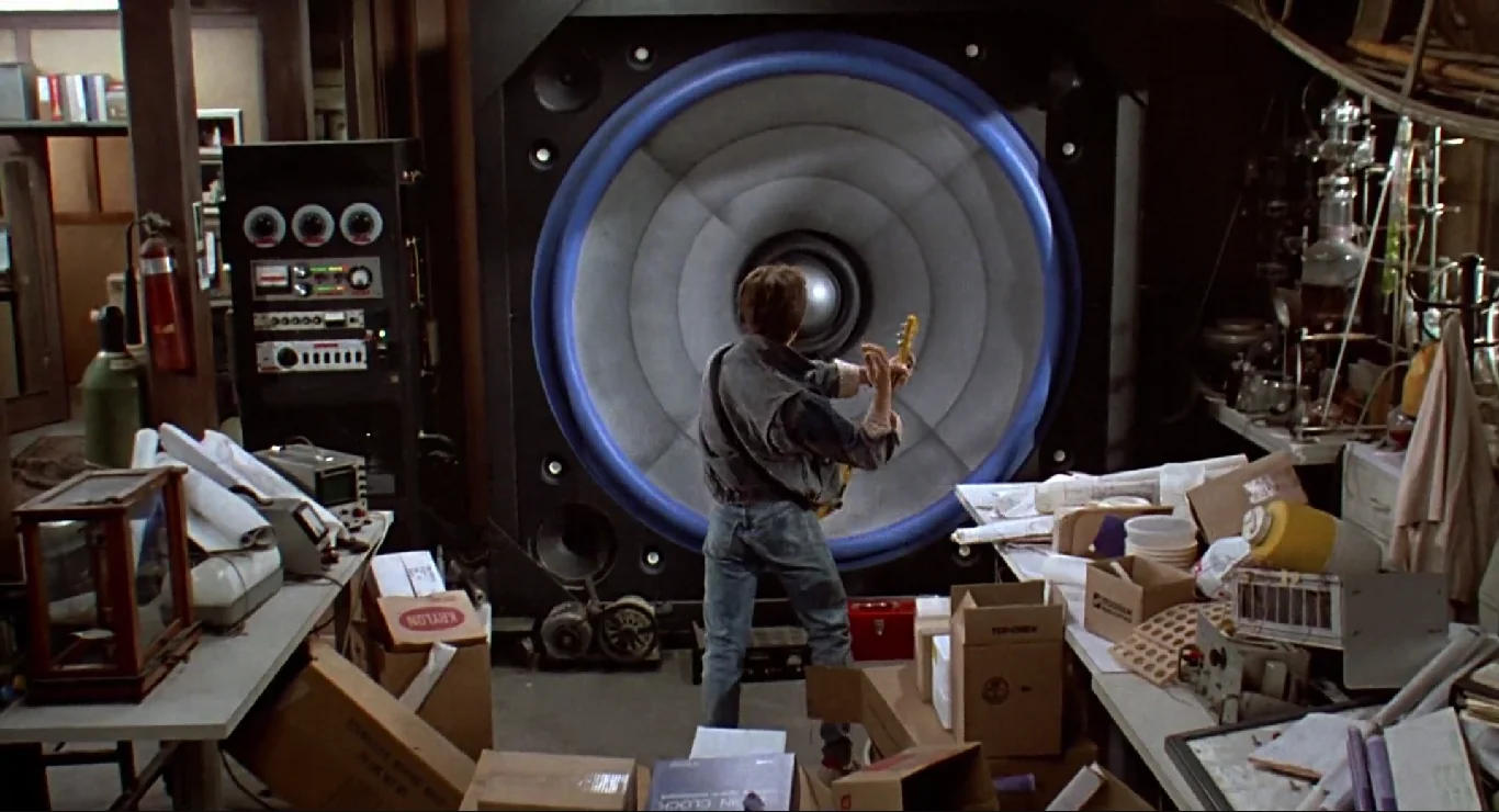 Cuando Marty McFly entró al garaje el 25 de octubre de 1985 para tocar su guitarra, subió al máximo el volumen del amplificador y las perillas de control. Tocando un solo "acorde de potencia", de repente fue arrojado hacia atrás contra una estantería y la parte delantera del altavoz quedó destrozada. Segundos después, sonó el teléfono: era Doc, que había llamado a su propia casa para advertir a Marty —demasiado tarde— que podría sobrecargarse.