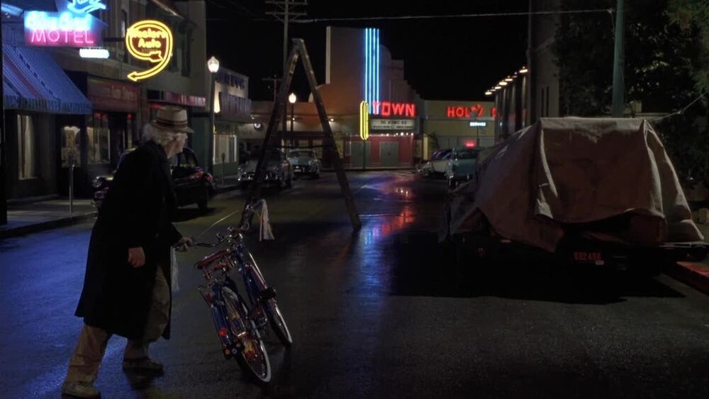 El 12 de noviembre de 1955, luego de que Marty y Doc llegaran en el DeLorean para recuperar un almanaque deportivo que un anciano Biff Tannen le entregó a su contraparte más joven para enriquecerse, Marty se quedó atrapado en el garaje de la residencia Tannen. Al enterarse de esto, Doc compró una bicicleta para movilizarse más rápido y rescatarlo, junto a un sombrero para disfrazarse.