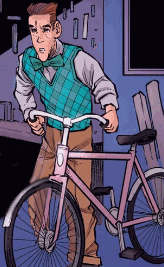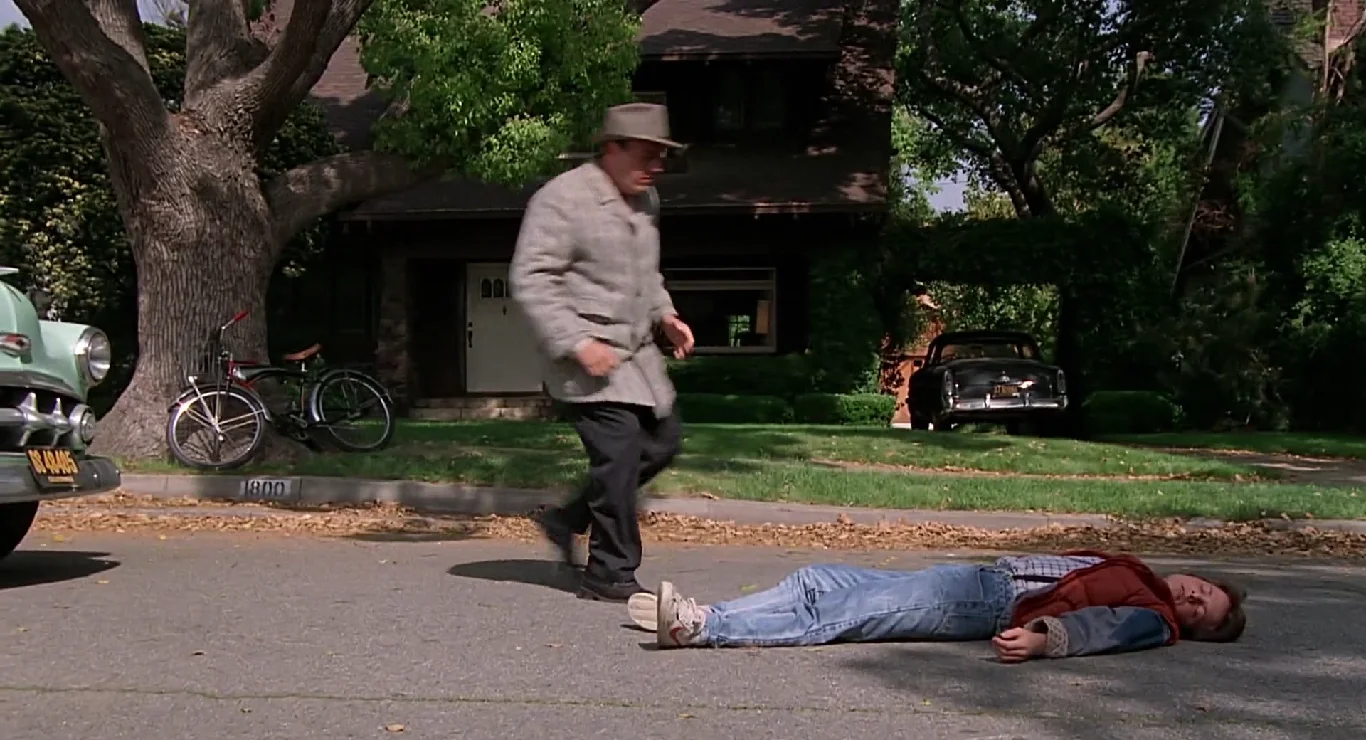 "Doc supuso que esto [su llegada tardía al garaje de Biff] tenía algo que ver con el tiempo que le tomó llegar aquí. Bueno, le tomó un poco de tiempo comprar la bicicleta, después de darse cuenta de que era lo mejor que podía hacer con el dinero de 1955 que le quedaba. Vaya, ni siquiera había quitado la etiqueta del precio de la bicicleta, tanta prisa tenía. Pero entonces, por supuesto, necesitaba comprar este sombrero que estaba usando, para disfrazarse, por supuesto. Bueno, no era un gran disfraz, era solo un sombrero, pero Doc no había tenido mucho tiempo para comprarlo. / Incluso entonces, sin embargo, habría llegado aquí antes si hubiera podido tomar una ruta más directa. Suspiró. Ese era uno de los problemas de viajar por el tiempo. Aún no se habían construido un par de caminos que esperaba tomar para llegar allí. Y entonces sus músculos comenzaron a quejarse. Ese era otro problema con todo este viaje en el tiempo: cuando te sientas en un DeLorean todo el día, ¡acabas descuidando el ejercicio que tanto necesitabas!"