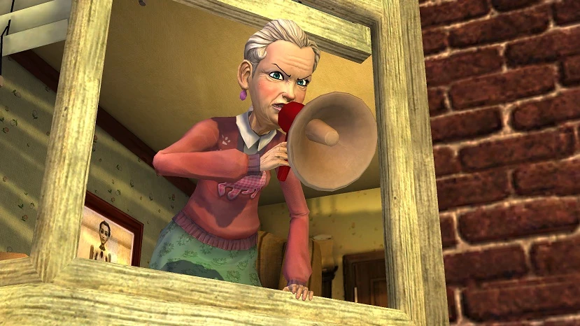 Edna gritando a través de un megáfono, algo habitual en su vejez.