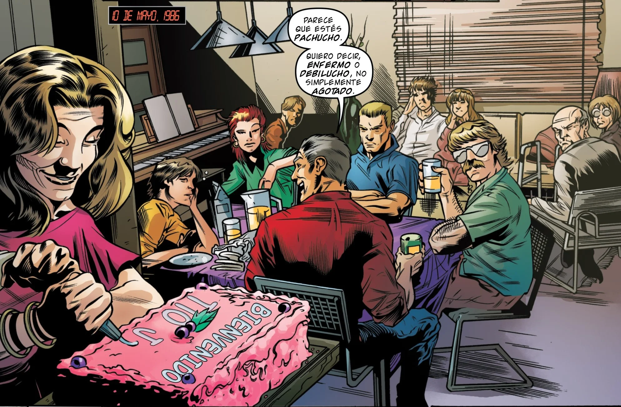 - "El comedor ya estaba medio lleno de gente. Sentados a la mesa, listos para cenar, estaban Milton, de doce años, que llevaba una gorra de piel de mapache Davy Crockett; Sally, de seis; Toby, de cuatro; y en el corralito en el piso, Joey, de once meses. / Stella hizo las presentaciones. Marty estaba absolutamente fascinado al ver a su tía y a sus tíos tan diferentes."