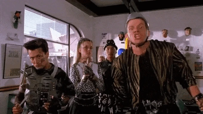En 2015, Griff llamó "gallina" a Marty (quien creía que era Marty McFly, Jr.). Este insulto venía con efectos de sonido de cloqueo de pollo agregados por la coraza computarizada que llevaba su compañero de pandilla Data, mientras Griff extendía su bate detrás de su espalda. En lugar de salir del Café 80's como se suponía que debía hacer, Marty se quedó y retó a Griff a pelear. Esto resultó en una persecución por la Plaza de la Corte en hoverboard y, finalmente, en el arresto de Griff y su pandilla.